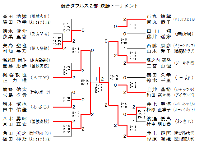 | 八木 勇輝 宮田 真衣 (星城高校) | ○ 15-13 15-10 | ○ 15- 4 15-10 | ○ 15- 6 15- 7 | 1 | |